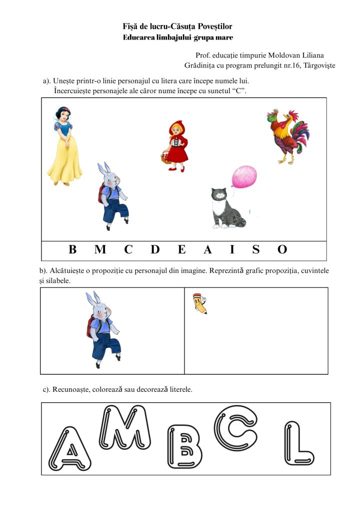 Fișă de lucru Grupa mare -Educarea limbajului Căsuța poveștilorEducație Timpurie, Grădiniță, Grupa mare / Autor Cadru didactic Fisa-de-lucru_Educarea-Limbajului_grupa-mare.pdf (1 Descărcări ) Moldovan LilianaProfesor pentru educație timpurie la Grădinița cu Program Prelungit Nr. 16 Târgoviște; Distribuie pe: 0 Distribuiri Facebook 0 Email Imprimă Copiază legătura
