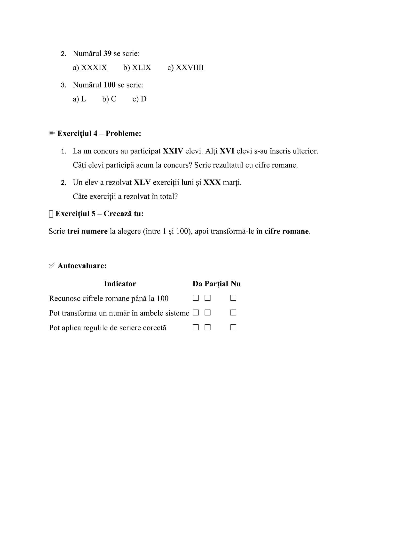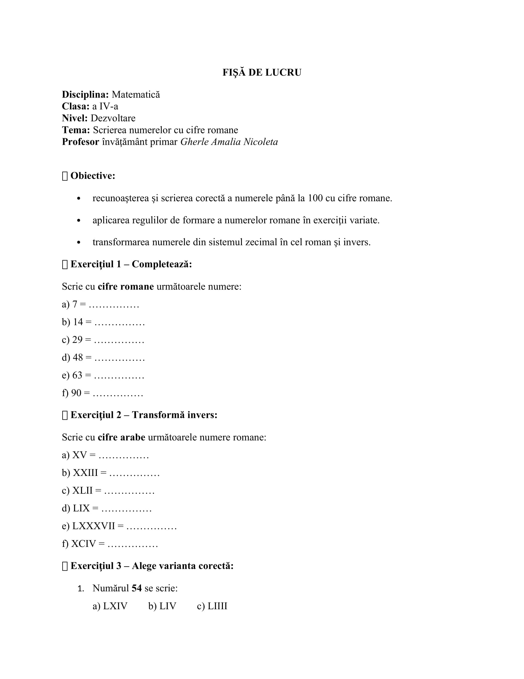 Fișă de lucru Clasa a IV-a Scrierea numerelor cu cifre romane(Dezvoltare)Clasa a IV-a, Clasele primare, Matematică / Autor Cadru didactic Scrierea-numerelor-cu-cifre-romane.docx (1 Descărcări ) Gherle Amalia NicoletaProfesor învățământ primar la Școala Gimnazială Nr. 1 Remetea; Distribuie pe: 0 Distribuiri Facebook 0 Email Imprimă Copiază legătura