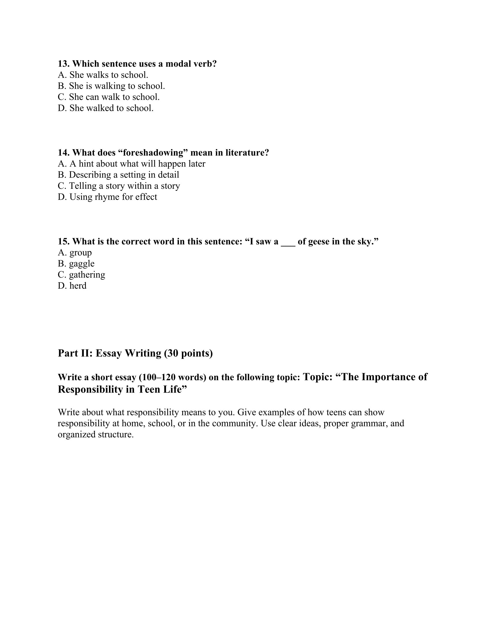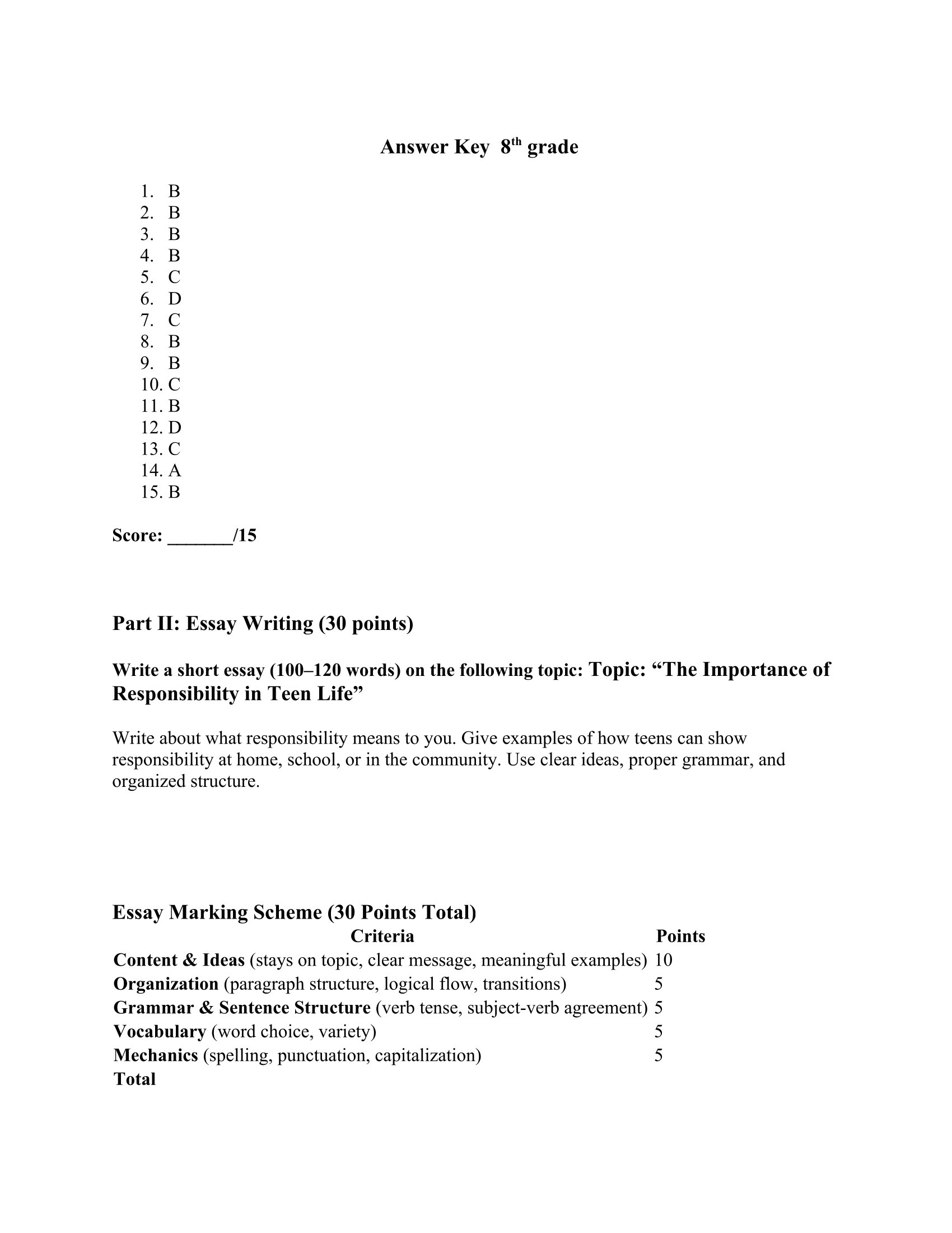 Paper Test 8th gradeClasa a VIII-a, Clasele gimnaziale, Limba engleză / Autor Cadru didactic English-Test-cls-aVIIIa-verificare.docx (0 Descărcări ) Corbea Florina MihaelaProfesor de Limba engleză la Liceul Teoretic Nicolae Titulescu Slatina; Distribuie pe: 0 Distribuiri Facebook 0 Email Imprimă Copiază legătura