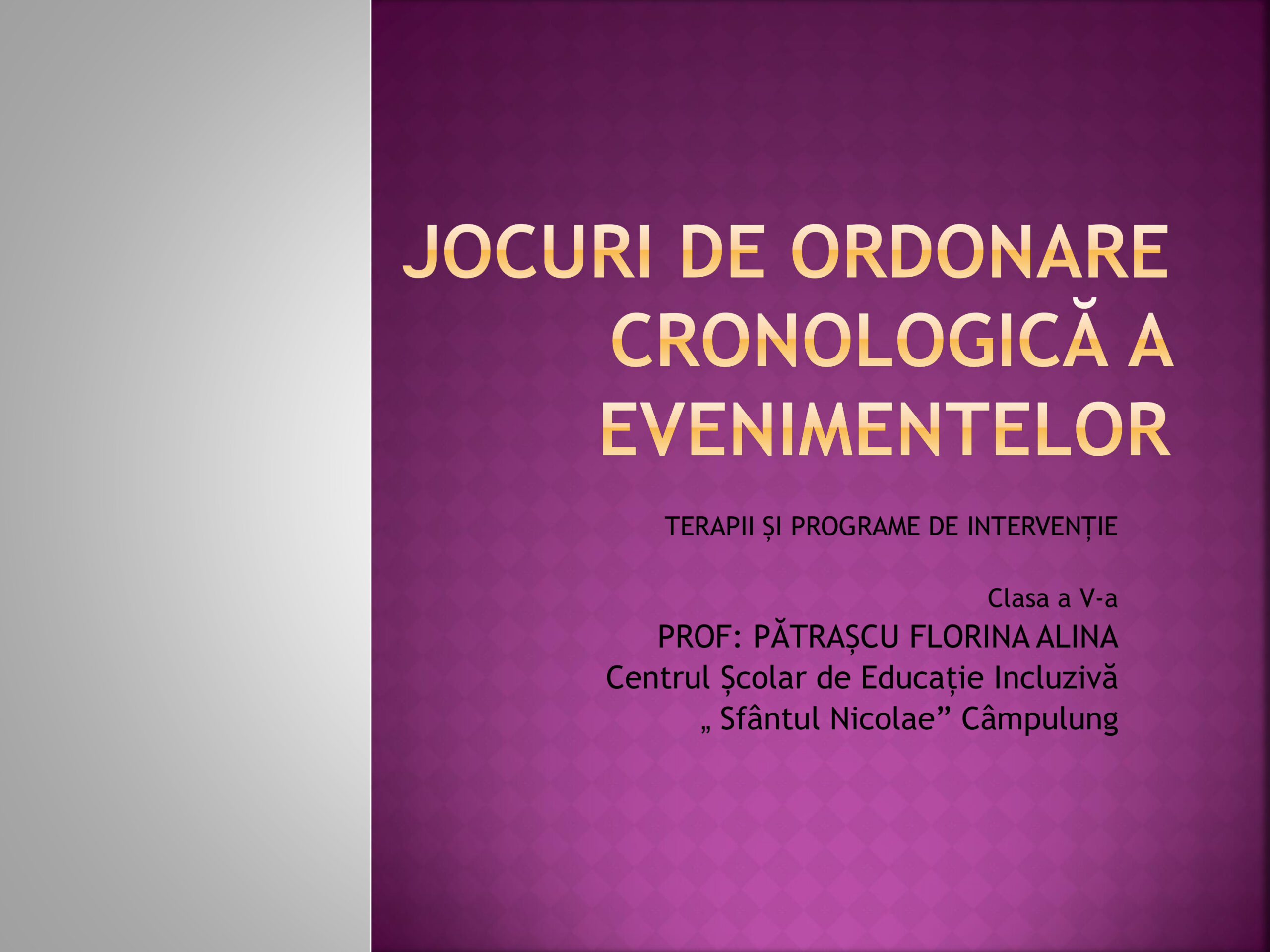 Jocuri de ordonare cronologică a evenimentelor-Terapii și programe de intervenție Clasa a V-aSoft Educațional / Autor Cadru didactic Ordonarea-si-succesiunea-evenimentelor.pptx (1 Descărcări ) Pătrașcu Florina AlinaProfesor la Centrul Școlar de Educație Incluzivă ”Sfântul Nicolae” Câmpulung; Distribuie pe: 0 Distribuiri Facebook 0 Email Imprimă Copiază legătura