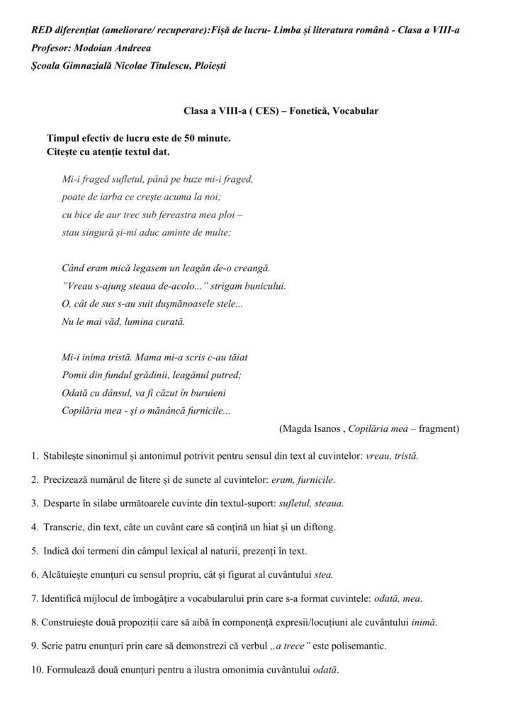 Profesor titular de Limba și literatura română la Școala Gimnazială Nicolae Titulescu, Ploiești, gradul didactic I, vechime la catedră 27 de ani;