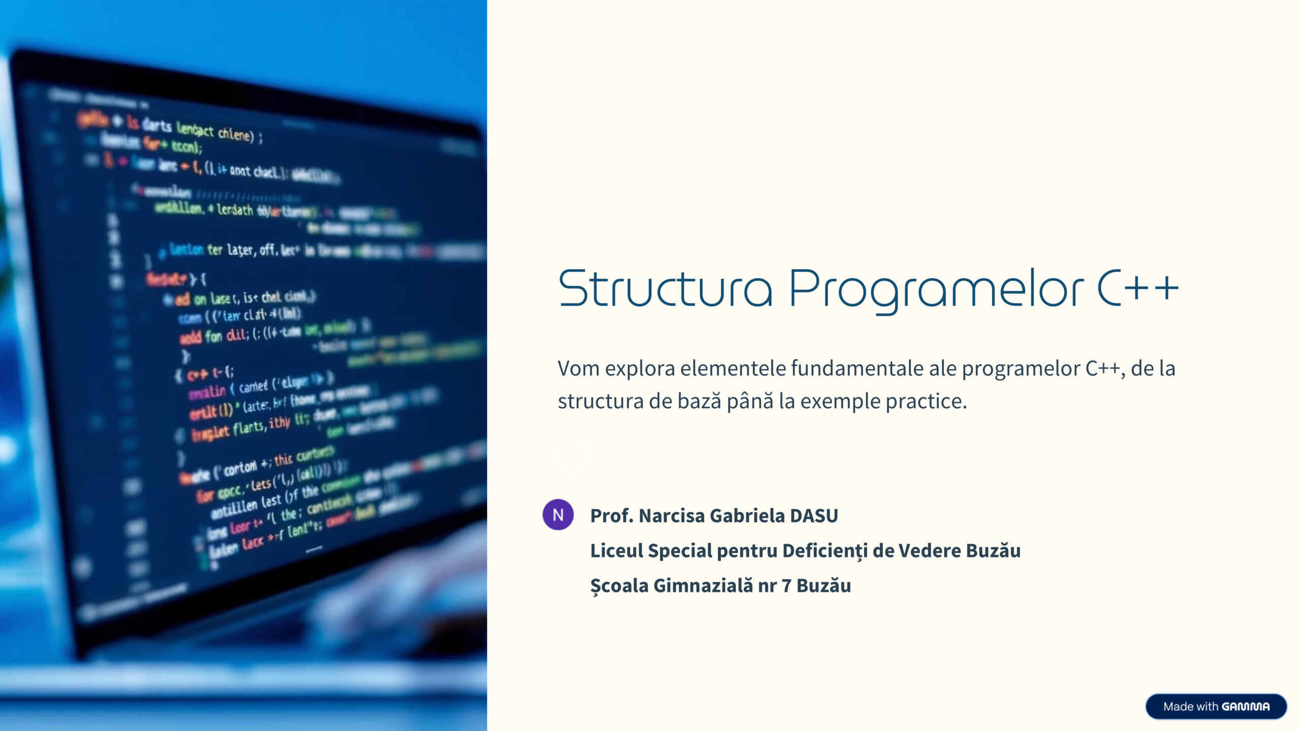 Profesor titular pe disciplinele Informatică și TIC la Liceul special pentru deficienți de vedere și Școala Gimnazială Nr. 7 Buzău, gradul didactic I, vechime în învățământ de 35 de ani, metodist al ISJ Buzău pe disciplina Informatică;