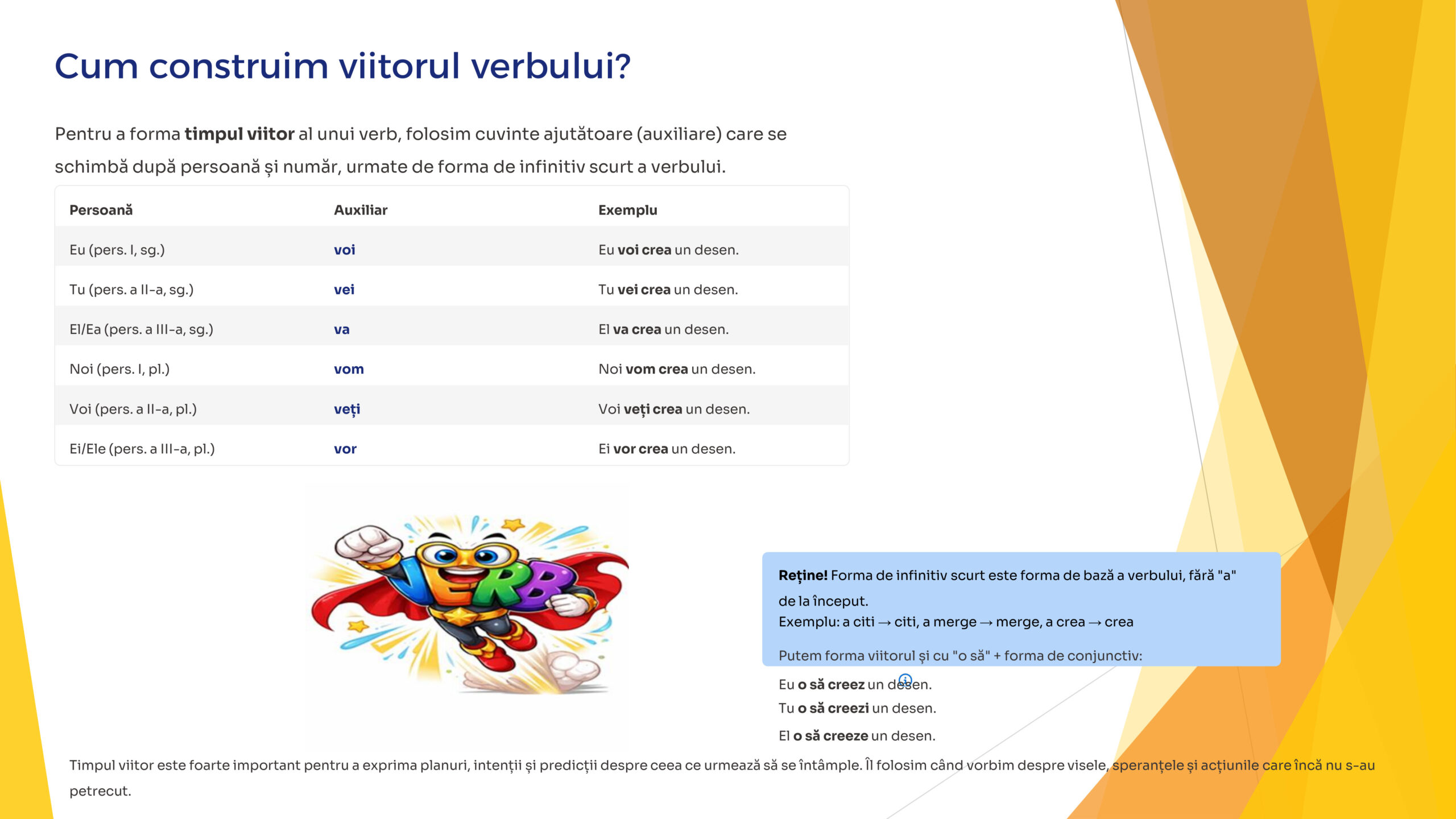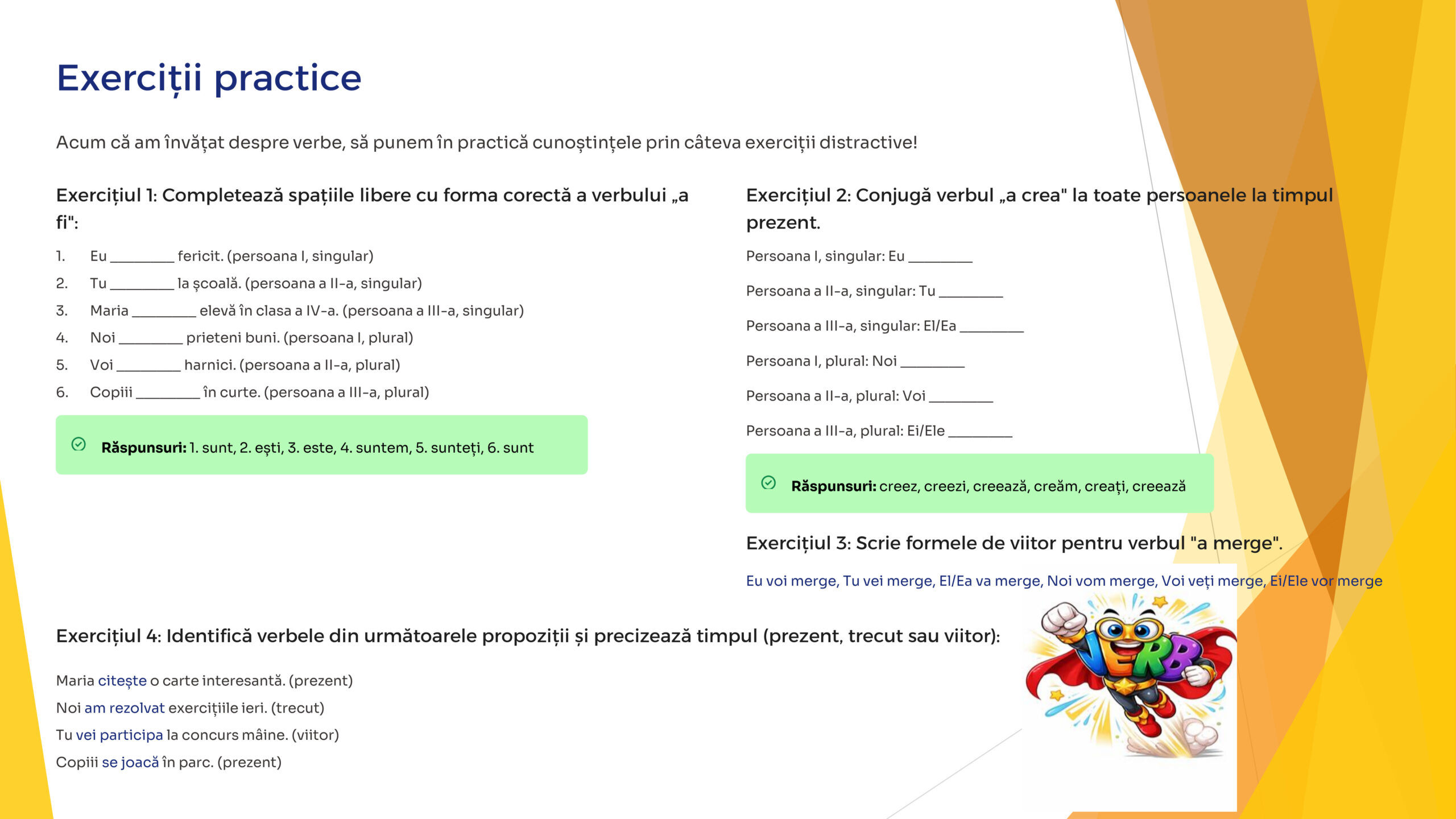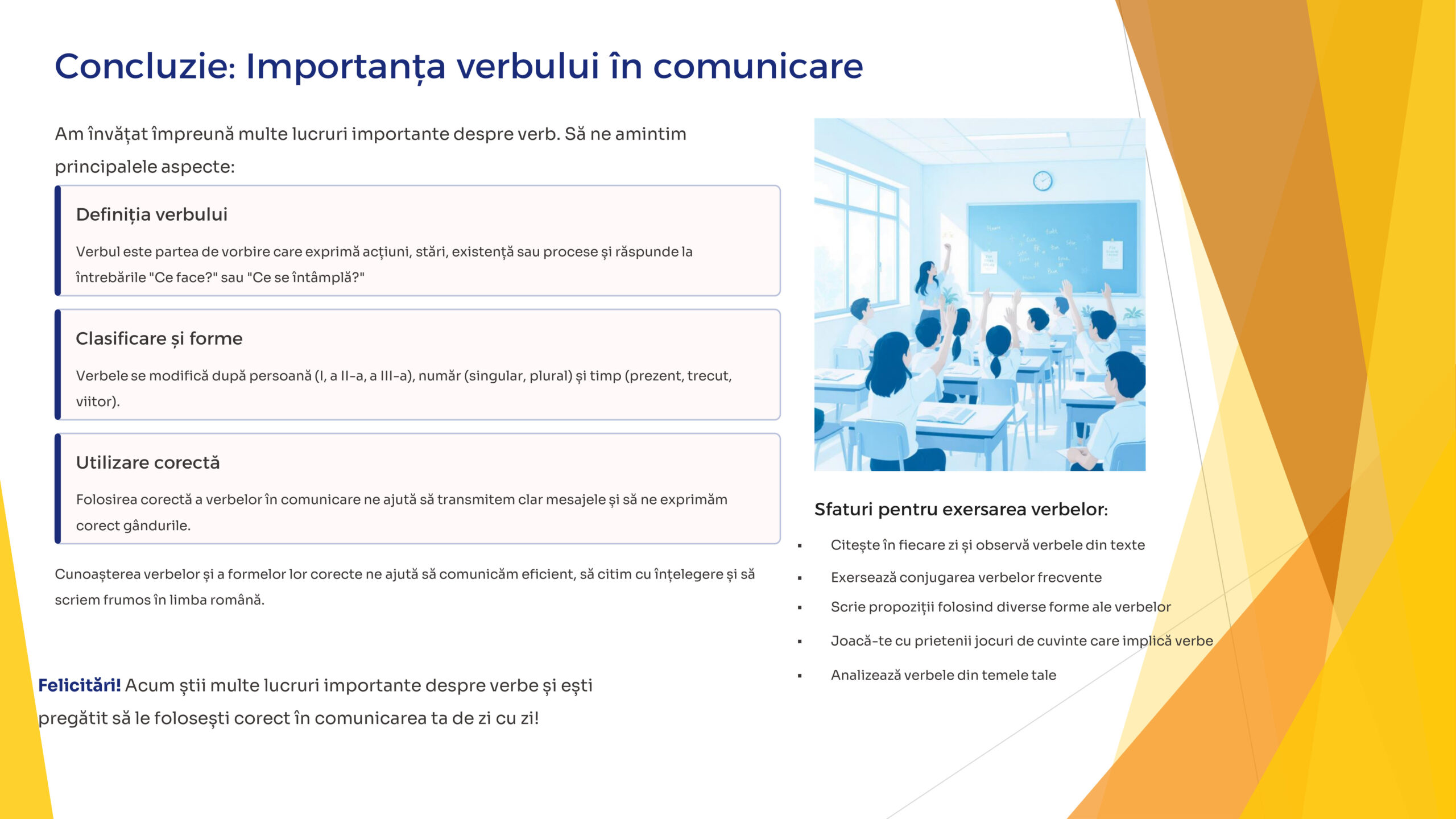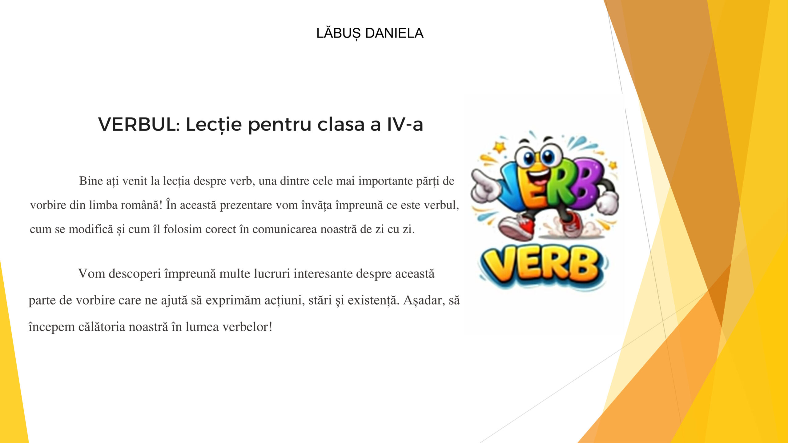 Verbul- Lecție pentru Clasa a IV-aClasa a IV-a, Clasele primare, Limba și literatura română, Soft Educațional / Autor Cadru didactic Soft-verb.pptx (0 Descărcări ) Lăbuș DanielaProfesor învățământ primar la Școala Gimnazială Nr.1 Brăhășești; Distribuie pe: 0 Distribuiri Facebook 0 Email Imprimă Copiază legătura