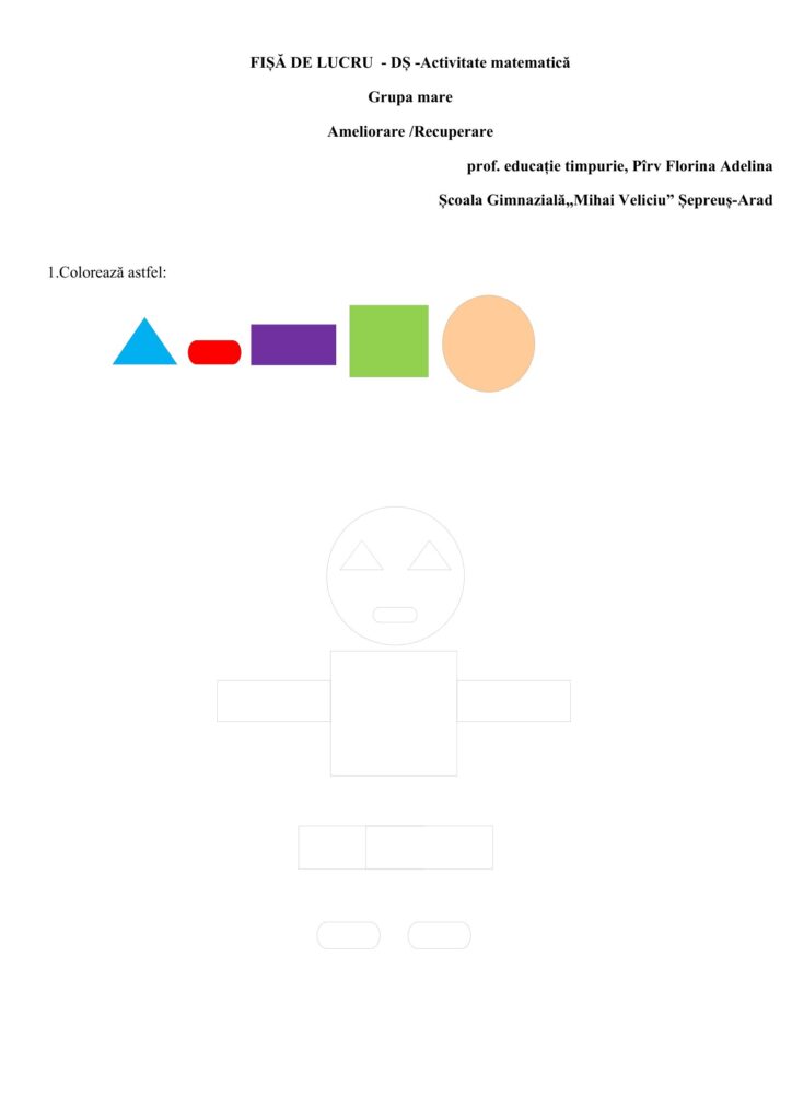 Fișă de lucru Grupa mare Domeniul Științe-Activitate matematică(Ameliorare /Recuperare)Educație Timpurie, Grădiniță, Grupa mare / Autor Cadru didactic Fisa-de-lucru-Activitate-matematica-_Forme-geometrice.docx (0 Descărcări ) Pîrv Florina AdelinaProfesor educație timpurie la Școala Gimnazială ,,Mihai Veliciu” Șepreuș Arad; Distribuie pe: 0 Distribuiri Facebook 0 Email Imprimă Copiază legătura