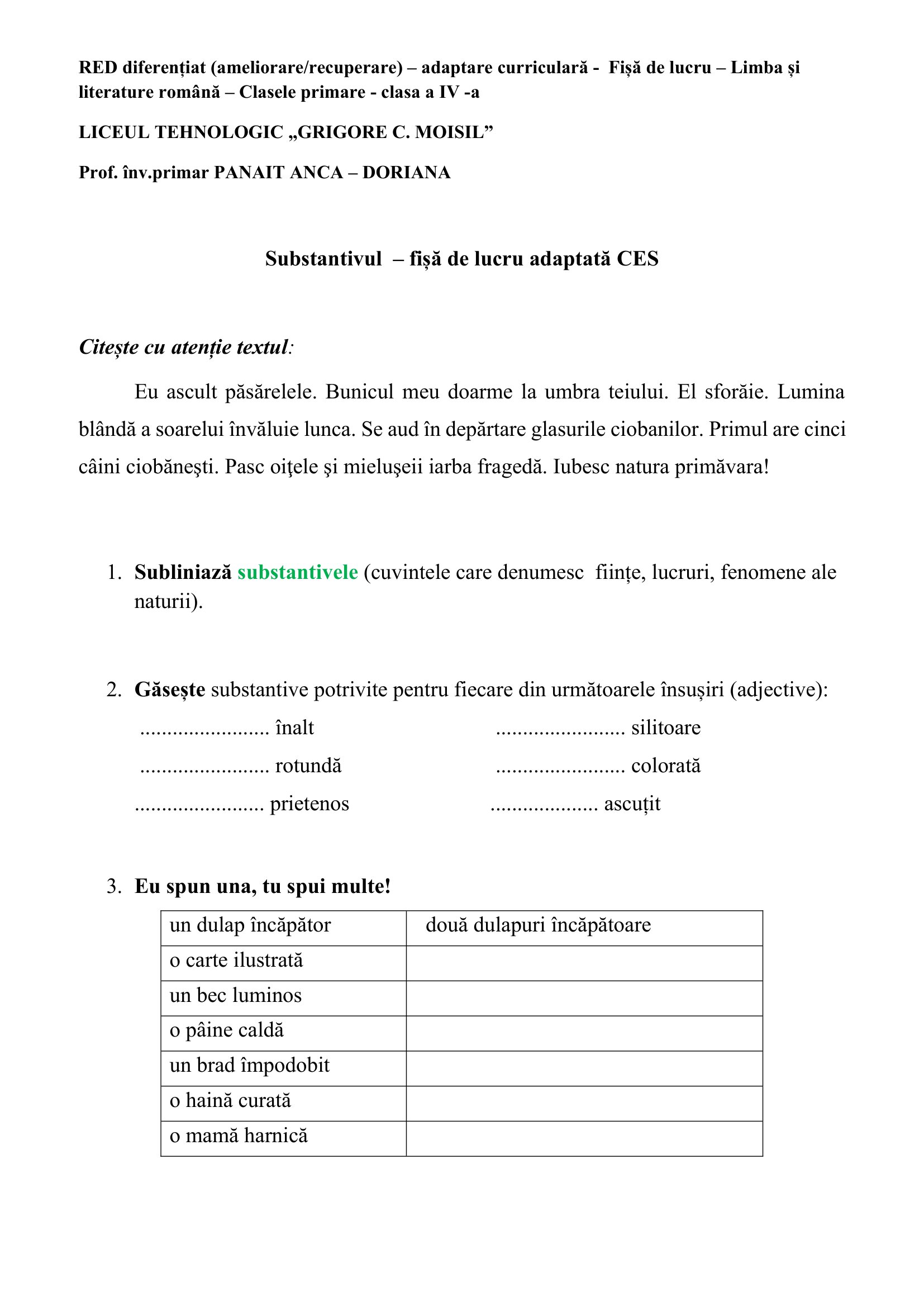 Fișă de lucru Limba și literatura română Clasa a IV -a Substantivul (CES)Clasa a IV-a, Limba și literatura română / Autor Cadru didactic Substantivul-fisa-de-lucru-CES.docx (0 Descărcări ) Panait Anca-DorianaProfesor învățământ primar la Liceul Tehnologic „Grigore C. Moisil”; Distribuie pe: 0 Distribuiri Facebook 0 Email Imprimă Copiază legătura