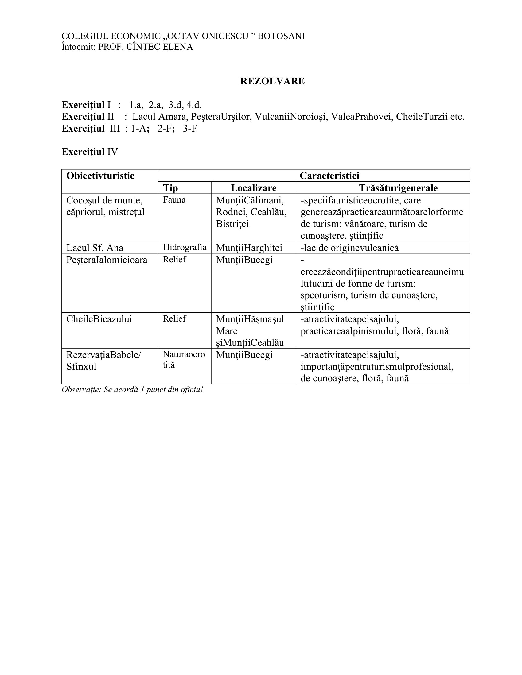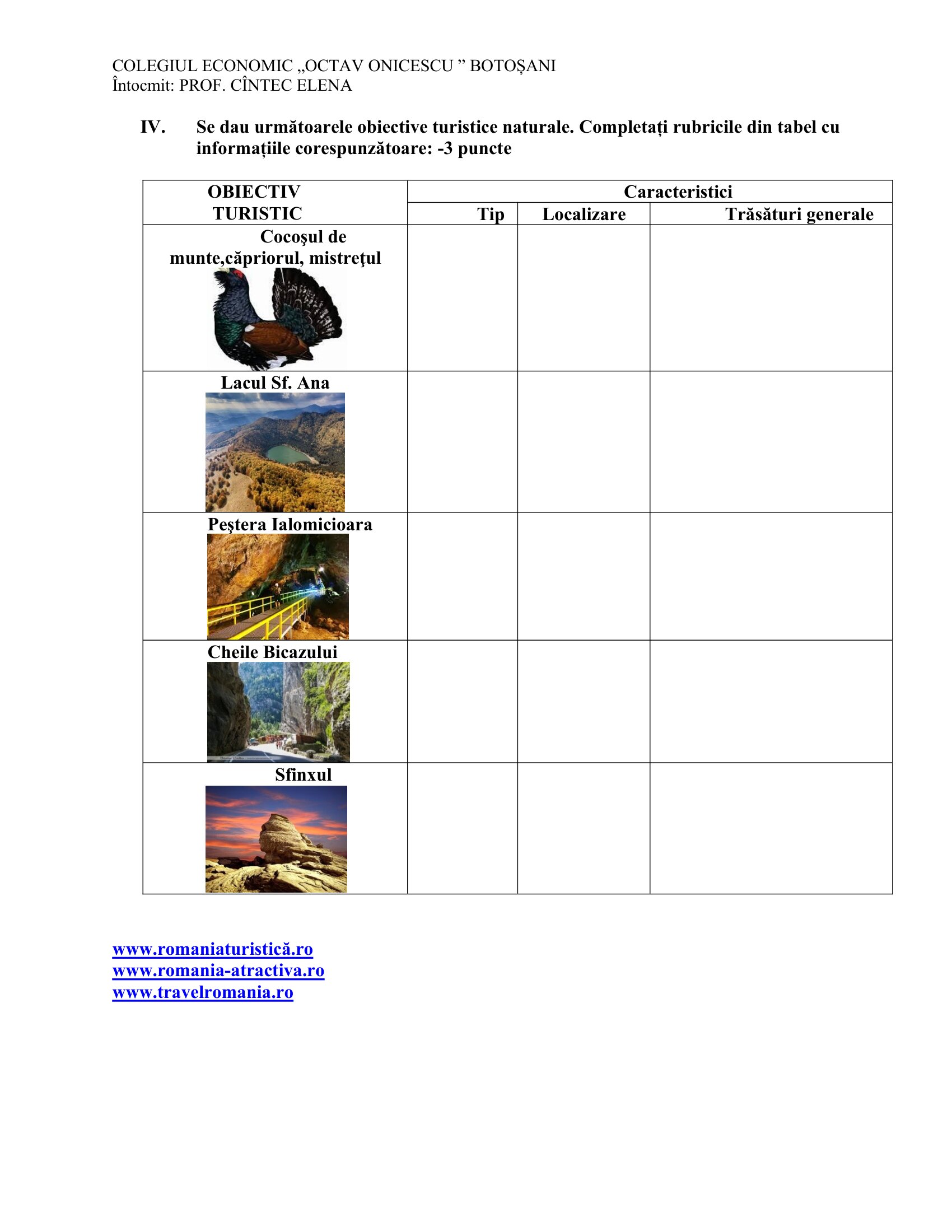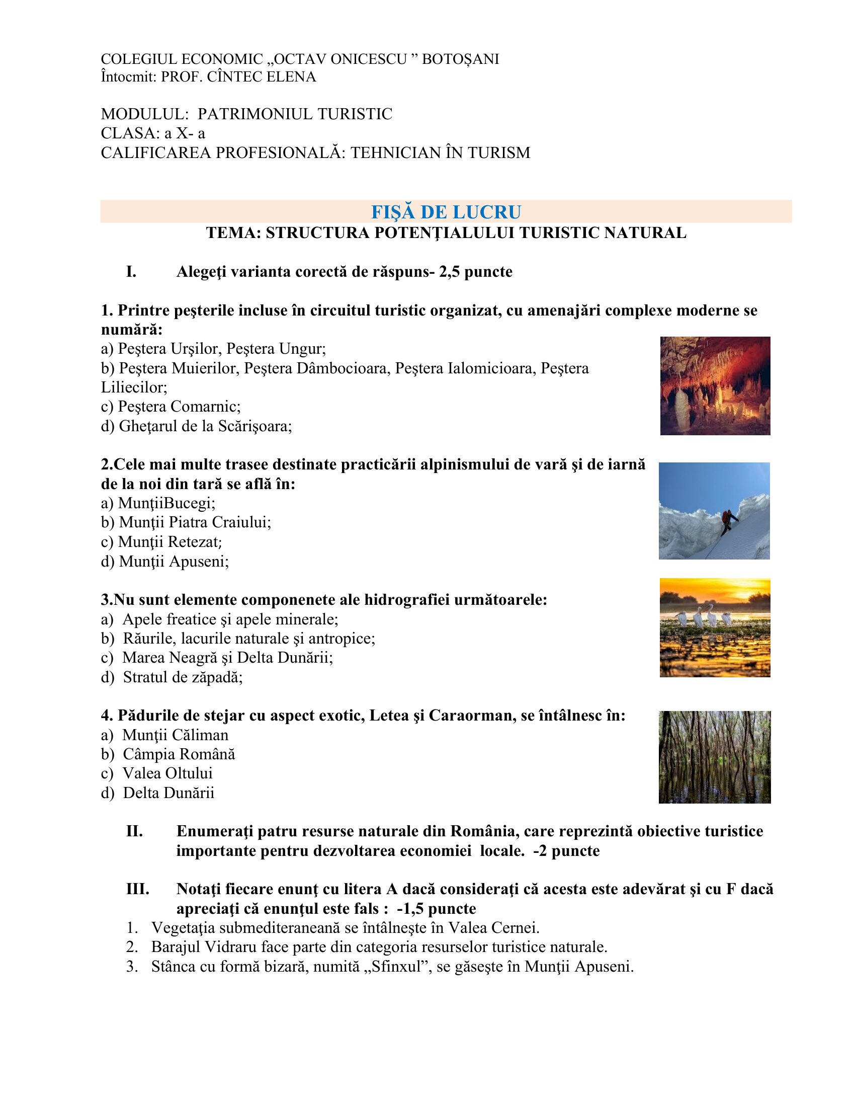 Fișă de lucru Clasa a X-a Strucutura potențialului turistic natural