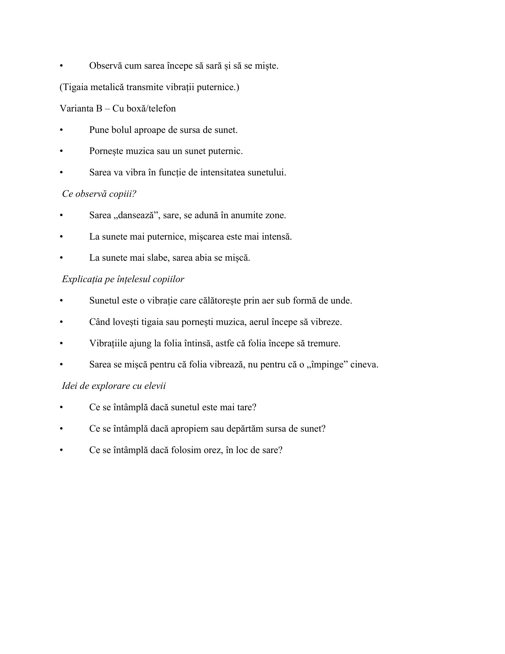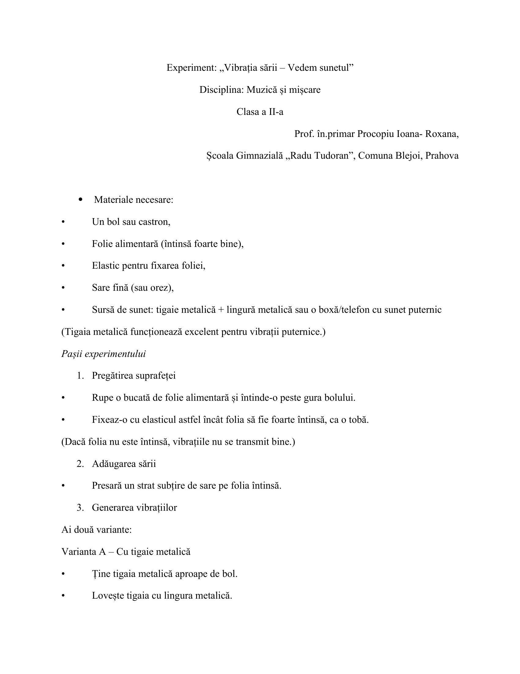 Experiment Muzică și mișcare „Vibrația sării – Vedem sunetul” Clasa a II-aClasa a II-a, Clasele primare / Autor Cadru didactic RED-Procopiu-Ioana-Roxana.docx (0 Descărcări ) Procopiu Ioana-RoxanaProfesor învățământ primar la Școala Gimnazială „Radu Tudoran”, Comuna Blejoi, Prahova; Distribuie pe: 0 Distribuiri Facebook 0 Email Imprimă Copiază legătura